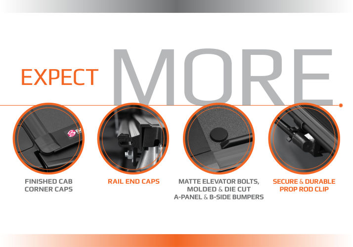 America’s #1 selling hard folding cover, the BAKFlip MX4, has new features, including matte-finished cab corner caps, rail-end caps, clamps, and elevator bolts for a more streamlined look and feel. Other MX4 features include an enhanced functionality with pre-molded, die-cut, shock-absorbent bumpers and secure prop rod clips.
