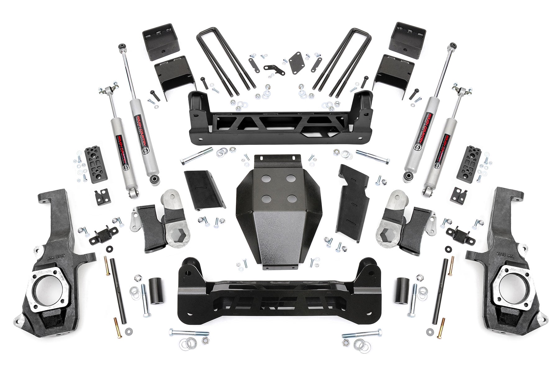 Right off the lot The GM 2500 HD has an impressive stance and a killer look, inspiring Rough Country to build a kit that would add crucial enhancements while taking nothing away from this sharp looking, new model truck. The 5" N3 Suspension Lift for GM 2500 HD features a Non-Torsion Drop Design for better clearance and handling while maintaining proper angles in a "clean and tucked away" fashion. This kit also features Heavy Duty components worthy of the HD badge; With 1/4" thick steel crossmembers, 1/2" thick NTD Brackets, and a durable, thick Skid Plate - all laser-cut and powder coated in our "Hammer Black" color to match the factory components. Installation requires no drilling or modifying the differential, meaning no "invasive" mods to your new toy. A set of braided Stainless Steel Brake Lines hones the whole package in.Our innovative HD lift doesn't just look like it came from the showroom floor, it drives like it did too. This kit doesn't widen the stock track width, and the Non Torsion Drop design keeps everything at optimum angles, leaving that factory feel to handling corners and turns. A full set of Nitrogen charged N3 Shock Absorbers offer 10-Stage velocity sensitive valving, and are custom valved for each model kit we offer - meaning you get a set of shocks designed to preserve your factory ride quality.