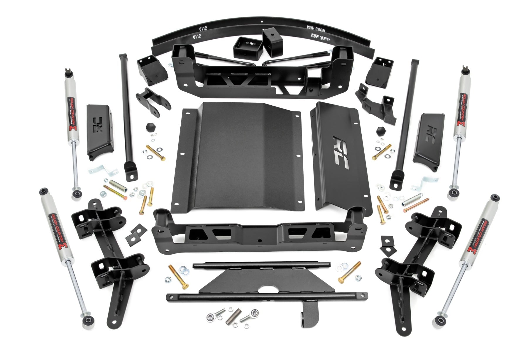 Rough Country?ÇÖs 6" Suspension Kit features (4) M1 monotubed shocks, giving your truck incredible ride-quality both on and off-road. This kit ships with a massive steering link and heim joint assist link. Rear lift blocks and add-a-leafs give plenty of clearance - enough to accommodate up to 33-inch tires. Our new and improved design allows your vehicle to retain its stock track width, and installation is now even easier.