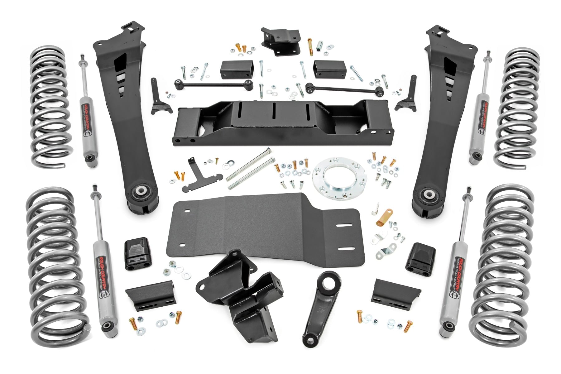 When changing a vehicle's suspension, the key to preserving ride quality is in keeping the geometry of all suspension components as close to their factory angles as possible. Rough Country's new 5-inch Suspension kit features a set of ultra-durable Radius Arms, precision fit to bolt right into the factory mounts for an easier install and a more factory-like angle. These beefy, upgraded Radius Arms also feature a durable, durable rubber bushings for maximum vibration absorption. This kit also includes a skid plate and a set of front and rear dual-rate lifted coil springs for unparalleled ride quality from your lifted Dodge Ram. The Dual Rate coil srpings?ácombine a relatively low initial spring rate, designed to absorb minor undulations and increase grip with a precise transition point and transition range to a secondary higher spring rate to improve handling and driveability.?á