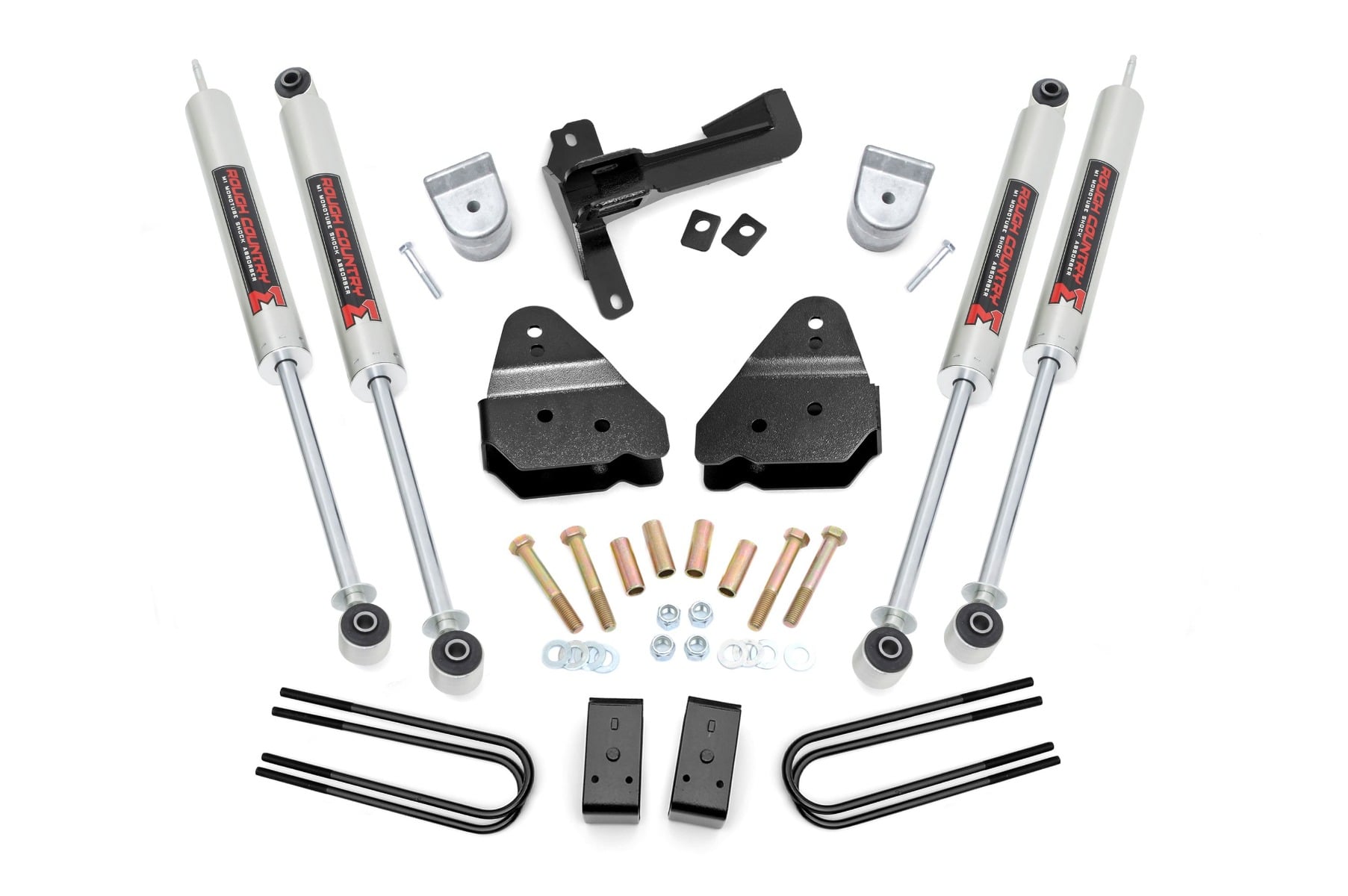 A set of Rough Country's premium N3 shocks are also included. These fine tuned 10-stage variable high-pressure Nitrogen charged shocks offer a fantastic blend of off-road action and smooth highway ride quality. With a durable 18mm spring-loaded piston rod and faster-cooling 54mm shock body.