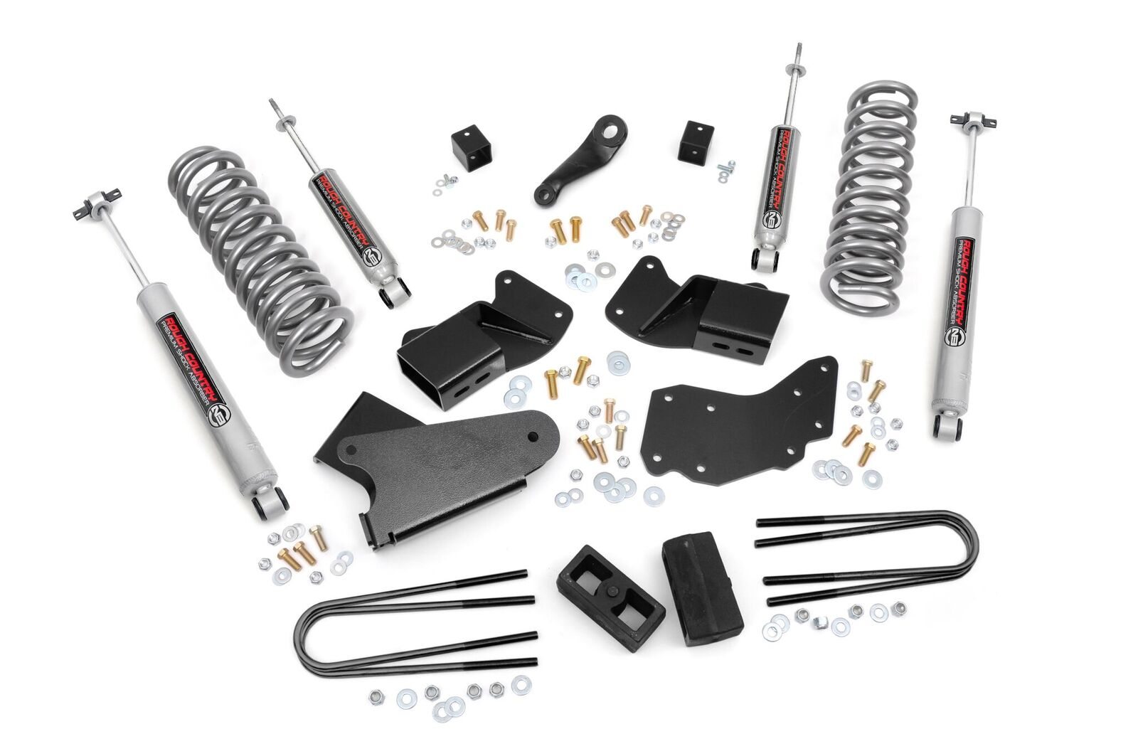 A set of Rough Country's premium N3 shocks are also included in this kit. These fine tuned 10-stage variable high-pressure Nitrogen charged shocks offer a fantastic blend of off-road action and smooth highway ride quality. With a durable 18mm spring-loaded piston rod and faster-cooling 54mm shock body.