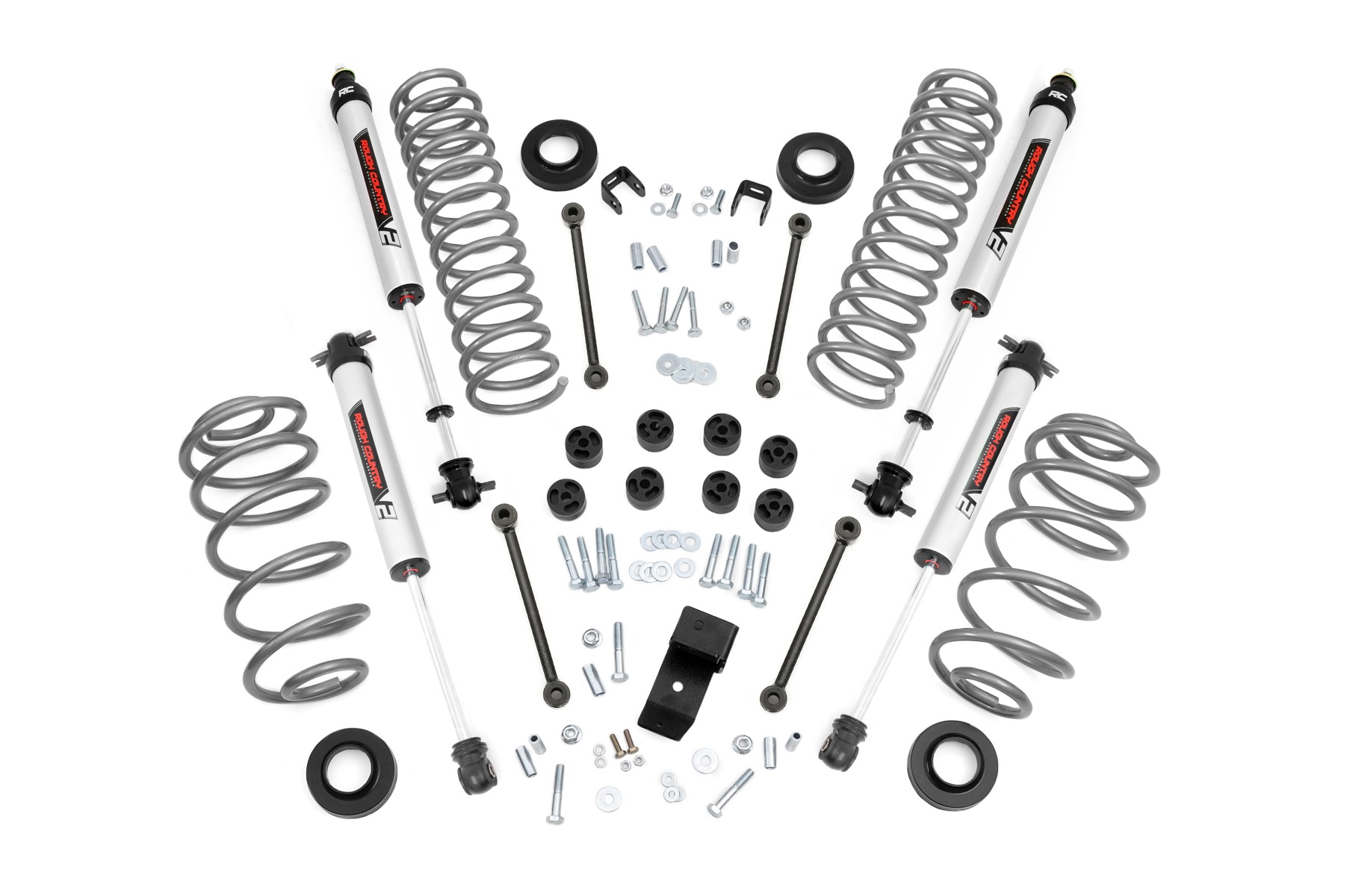 Looking to enhance your Jeep?ÇÖs off-road capabilities without compromising on highway comfort? The 3.25-inch Lift Kit by Rough Country delivers just that?Çöa perfect blend of rugged performance and smooth driving. Designed for easy installation and built for adventure, this kit will elevate your Jeep to new heights, both literally and figuratively!Effortless Bolt-On Installation: No need for complicated modifications?Çöinstallation is quick and hassle-free, so you can hit the trails sooner.Enhanced Ground Clearance: Gain extra height to conquer uneven terrain and improve off-road performance, giving you the edge on tough trails.Perfectly Leveling Your Ride: Achieve a well-balanced stance with this lift kit, leveling the front and rear of your Jeep for a smoother and more stable ride.Rear Track Bar Bracket for Precise Alignment: Ensure perfect rear axle alignment with this essential feature, improving handling and boosting overall stability, especially on rugged trails.Configurable Shock Options: Choose your ideal ride quality with customizable shock options, including nitrogen-charged N3, V2 Monotube, or M1 Monotube shocks. Take control of your Jeep?ÇÖs comfort and performance.This 3.25-inch Lift Kit comes complete with application-tuned, lifted coil springs, a transfer case drop kit, track bar bracket, and extended sway bar links, giving your Jeep everything it needs for enhanced off-road performance. Engineered by Rough Country?ÇÖs Research and Development Team, this lift kit is designed for drivers who demand both performance and comfort from their vehicle.
