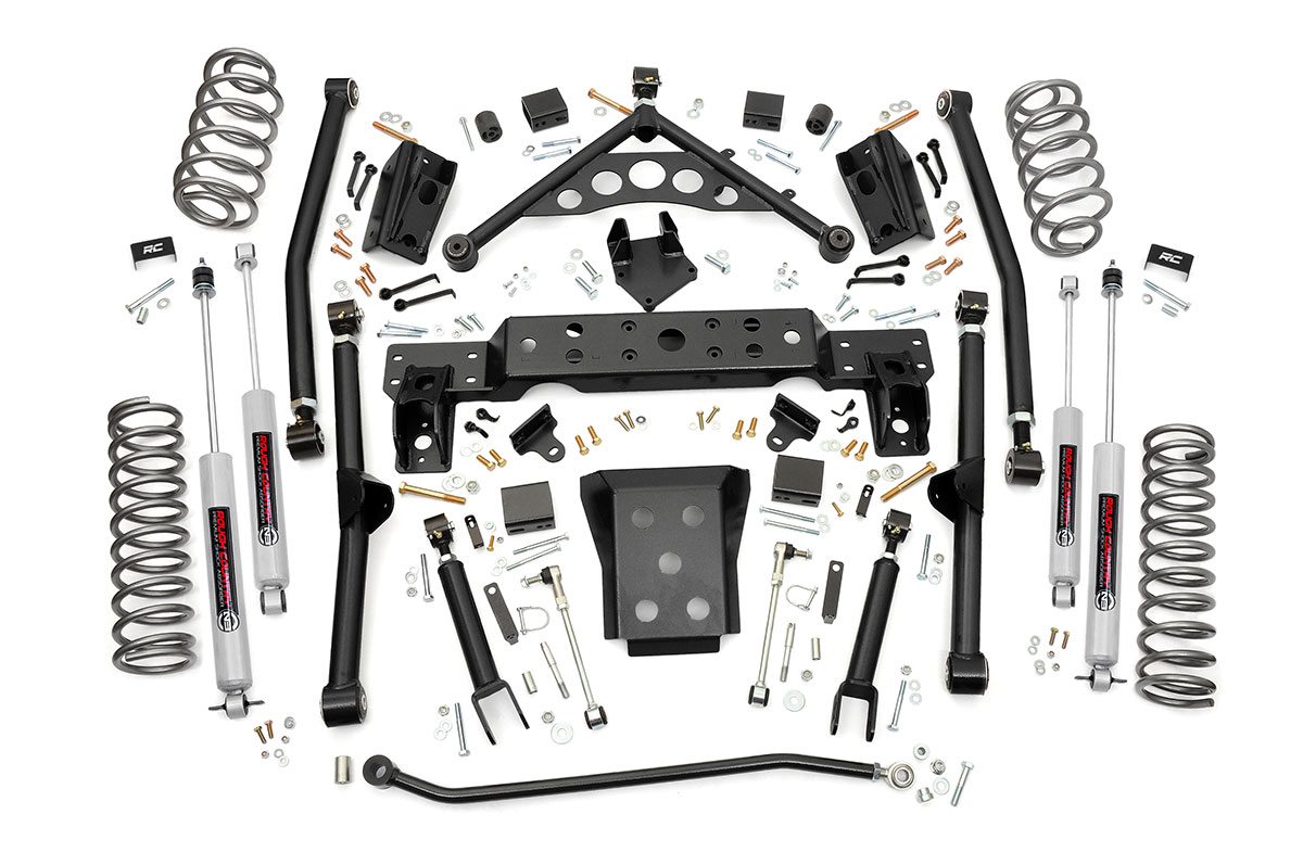 The long awaited WJ 4-inch Longarm Kit is a comprehensive package including everything needed for a great suspension lift while maintaining the vehicle's crucial center of gravity. Upgrade your WJ and gain aggressive looks, extreme flex, and enough ride height to run up to 31-inch tires. The kit includes adjustable high-clearance X-Flex upper and lower control arms with durable rubber bushings, featuringX-Flex joints. The kit also includes front and rear coil springs, a front adjustable track bar with drop bracket, 1/4-inch thick steel crossmember, skid plate and sway bar disconnects. Outfitted with Rough Country's N3 shocks, this Longarm Lift Kit is a total solution comprised of top-notch components designed for the avid off-roader who wants the most out of their WJ.